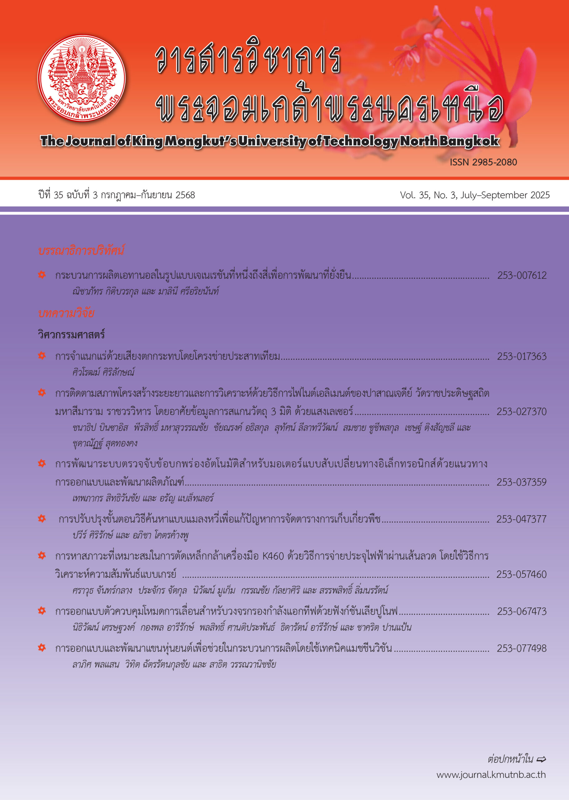 วารสารวิชาการพระจอมเกล้าพระนครเหนือ ปีที่ 35 ฉบับที่ 3 (กรกฎาคม-กันยายน 2568) ตุลาคม 2, 2025ตุลาคม 2, 2025ผู้ดูแลระบบE-JOURNALS, วารสารวิชาการวารสารวิชาการ กรกฎาคม-กันยายน, 2568 ปีที่ 35 ฉบับที่ 3 (2025) ผู้ดูแลระบบ